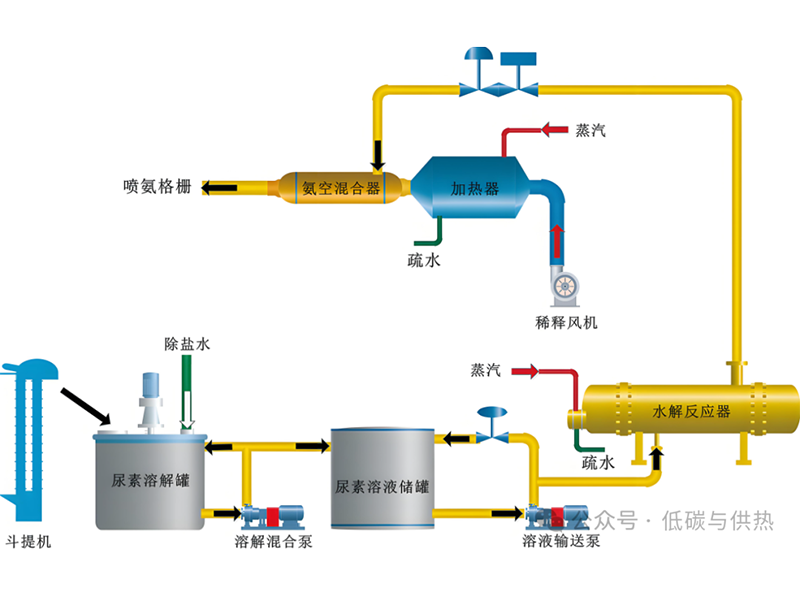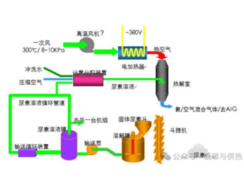 尿素脱硝:尿素的脱硝效率相对较低,通常比氨水脱硝效率约低10%。这主要是因为尿素分解产生氨的温度相对较高,需要在合适的温度区间内才能达到较好的脱硝效果。